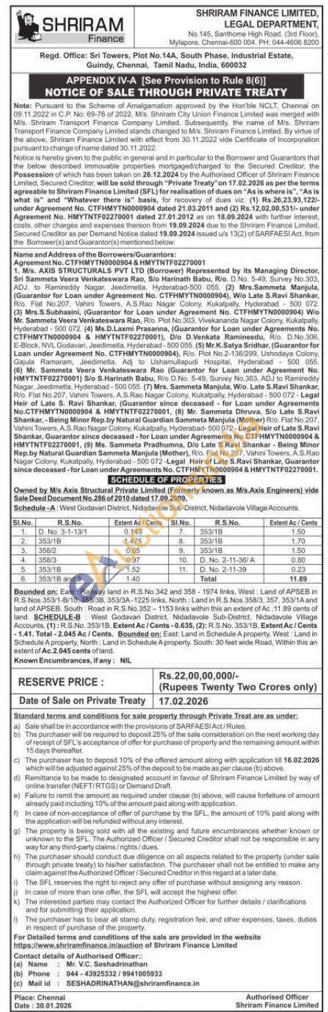 SCHEDULE OF PROPERTIES : Owned by M/s Axis Structural Private Limited (Formerly known as M/s.Axis Engineers) vide Sale Deed Document No.286 of 2010 dated 17.09.2009.