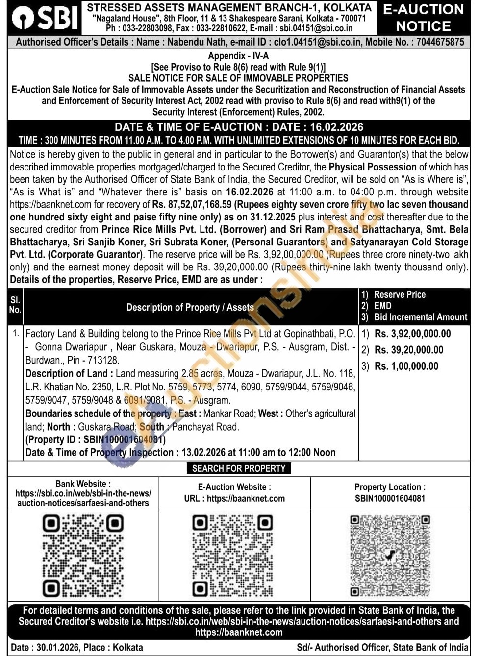 Factory Land & Building belong to the Prince Rice Mills Pvt Ltd at Gopinathbati, P.O. Gonna Dwariapur, Near Guskara, Mouza - Dwariapur, P.S. - Ausgram, Dist. Burdwan., Pin-713128.