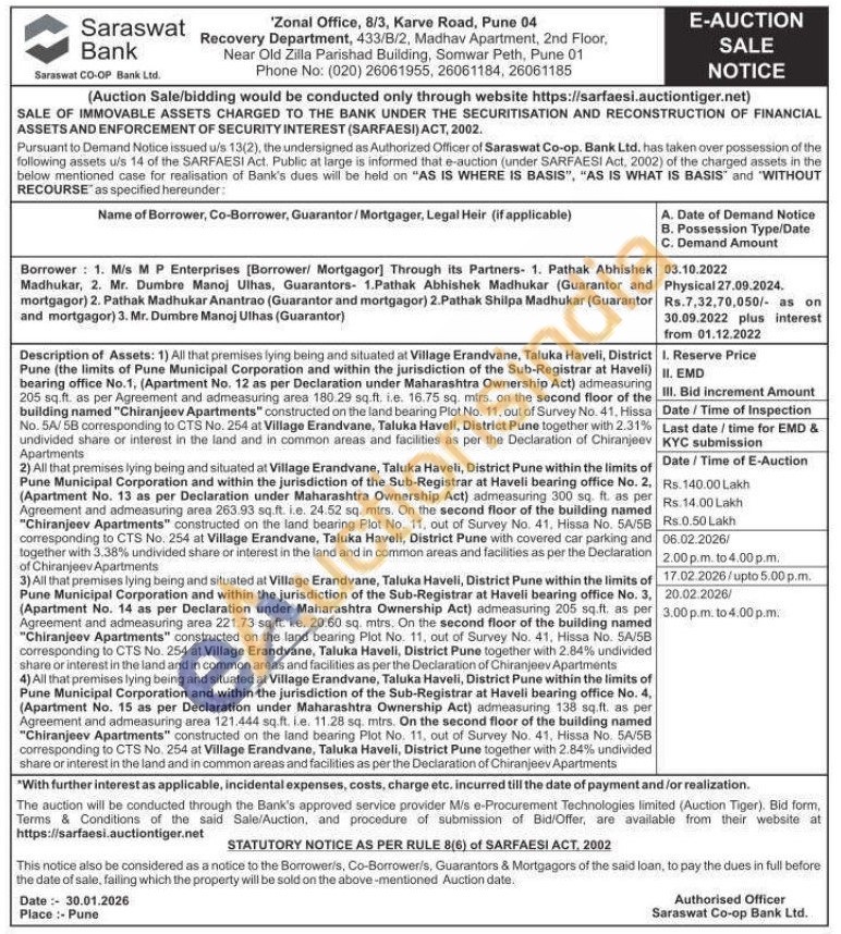 Description of Assets: 1) All that premises lying being and situated at Village Erandvane, Taluka Haveli, District Pune (the limits of Pune Municipal Corporation and within the jurisdiction of the Sub-Registrar at Haveli) bearing office No.1, (Apartment No. 12 as per Declaration under Maharashtra Ownership Act) admeasuring 205 sq.ft. as per Agreement and admeasuring area 180.29 sq.ft. i.e. 16.75 sq. mtrs. on the second floor of the building named "Chiranjeev Apartments" constructed on the land bearing Plot No. 11, out of Survey No. 41, Hissa No. 5A/5B corresponding to CTS No. 254 at Village Erandvane, Taluka Haveli, District Pune together with 2.31% undivided share or interest in the land and in common areas and facilities as per the Declaration of Chiranjeev Apartments