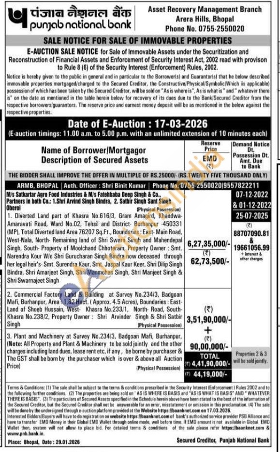 Commercial Factory Land & Building at Survey No.234/3, Badgoan Mafi, Burhanpur, Area: 1.82 Hact. (Approx. 4.5 Acres), Boundaries: East-Land of Shoeb Hussain, West Khasra No.233/1, North Road, South-Khasra No.238/2, Property Owner: Shri Arvinder Singh & Shri Satbir (Physical Possession) Singh