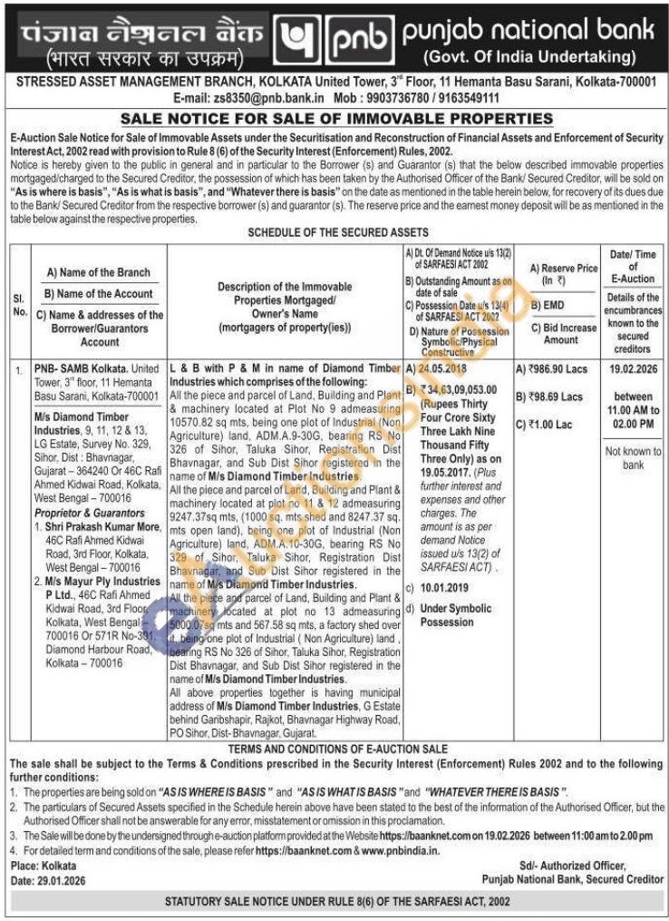 All the piece and parcel of Land, Building and Plant & machinery located at plot no 11 & 12 admeasuring 9247.37sq mts, (1000 sq. mts shed and 8247.37 sq. mts open land), being one plot of Industrial (Non Agriculture) land, ADM.A.10-30G, bearing RS No 329 of Sihor, Taluka Sihor, Registration Dist Bhavnagar, and Sub Dist Sihor registered in the name of Mis Diamond Timber Industries.