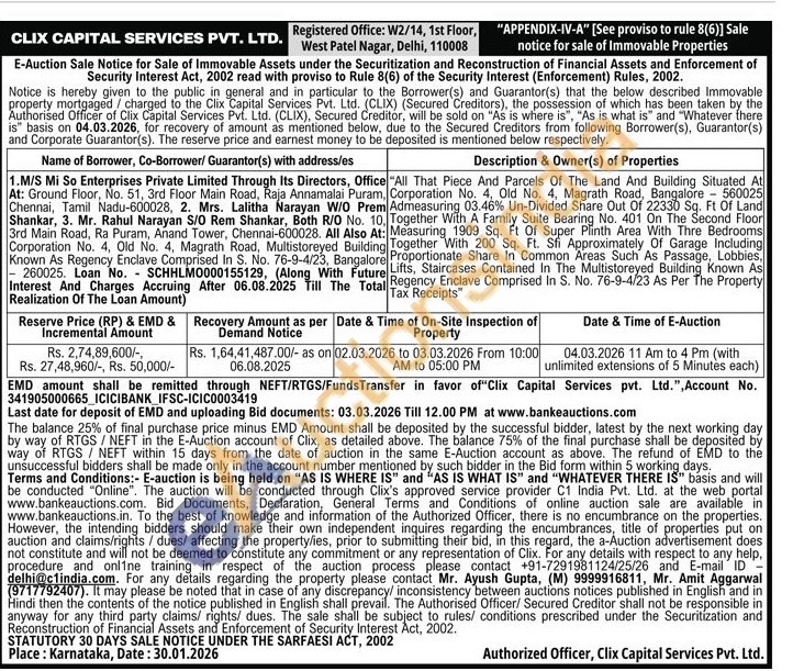 "All That Piece And Parcels Of The Land And Building Situated At , Corporation No. 4, Old No. 4, Magrath Road, Bangalore 560025 Admeasuring 03.46% Un-Divided Share Out Of 22330 Sq. Ft Of Land , Together With A Family Suite Bearing No. 401 On The Second Floor : Measuring 1909 Sq. Ft Of Super Plinth Area With Thre Bedrooms Together With 200 Sq. Ft. Sfi Approximately Of Garage Including Proportionate Share In Common Areas Such As Passage, Lobbies, Lifts, Staircases Contained In The Multistoreyed Building Known As Regency Enclave Comprised In S. No. 76-9-4/23 As Per The Property Tax Receipts