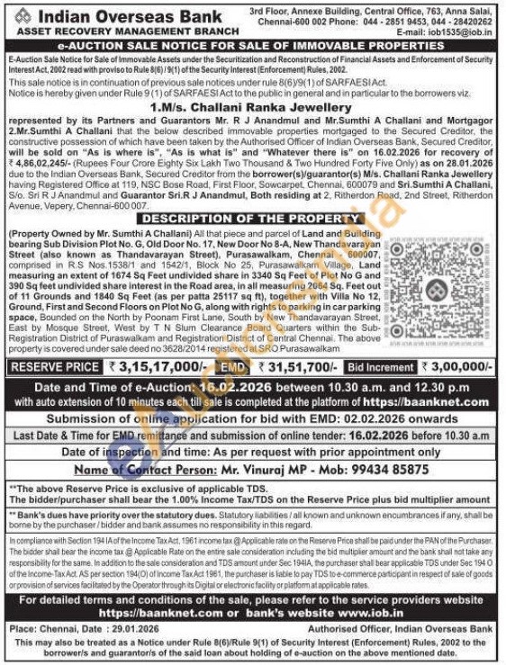 (Property Owned by Mr. Sumthi A Challani) All that piece and parcel of Land and Building bearing Sub Division Plot No. G. Old Door No. 17, New Door No 8-A, New Thandavarayan Street (also known as Thandavarayan Street), Purasawalkam, Chennai 600007, comprised in R.S Nos. 1538/1 and 1542/1, Block No 25, Purasawalkam Village, Land measuring an extent of 1674 Sq Feet undivided share in 3340 Sq Feet of Plot No G and 390 Sq feet undivided share interest in the Road area, in all measuring 2064 Sq. Feet out of 11 Grounds and 1840 Sq Feet (as per patta 25117 sq ft), together with Villa No 12, Ground, First and Second Floors on Plot No G, along with rights to parking in car parking space, Bounded on the North by Poonam First Lane, South by New Thandavarayan Street, East by Mosque Street, West by T N Slum Clearance Board Quarters within the Sub Registration District of Puraswalkam and Registration District of Central Chennai. The above property is covered under sale deed no 3628/2014 registered at SRO Purasawalkam