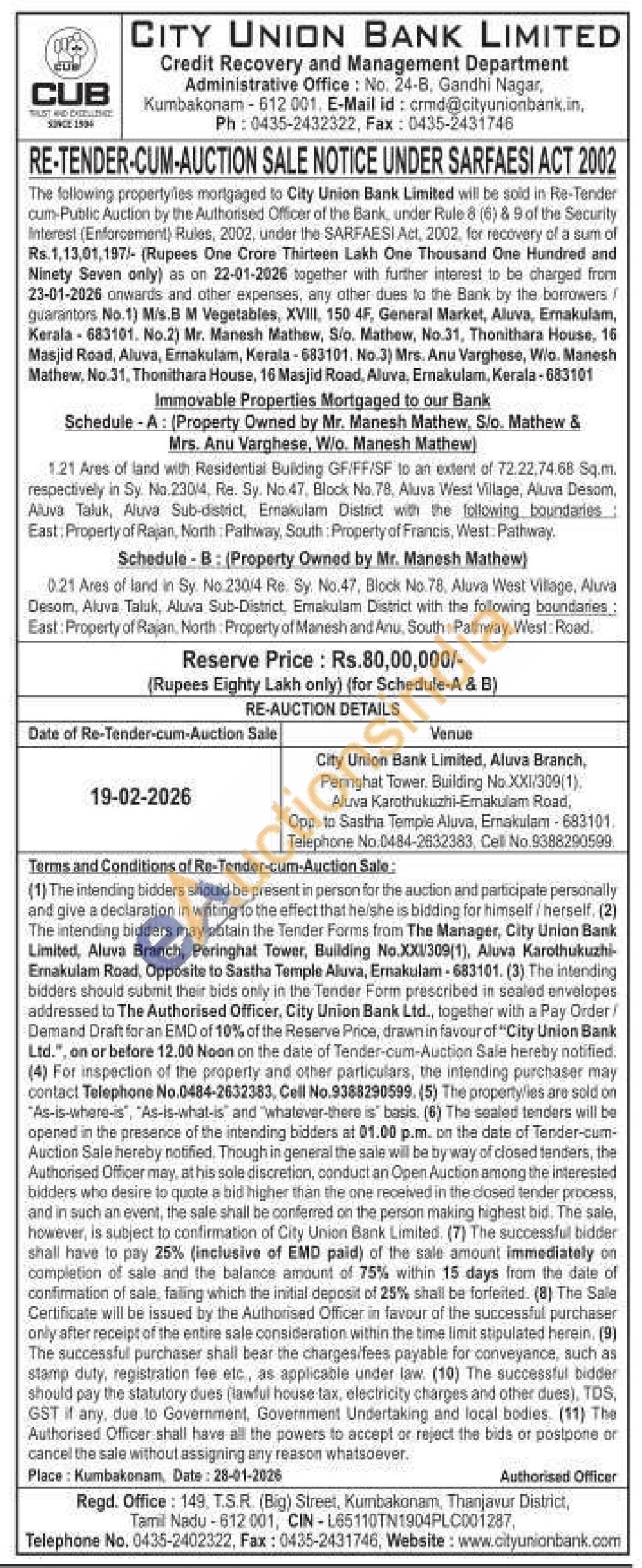 1.21 Ares of land with Residential Building GF/FF/SF to an extent of 72.22,74.68 Sq.m. respectively in Sy. No.23014, Re. Sy. No.47, Block No.78, Aluva West Village, Aluva Desom, Aluva Taluk, Aluva Sub-district, Ernakulam District with the following boundaries: East: Property of Rajan, North Pathway, South Property of Francis, West: Pathway. Schedule-B: (Property Owned by Mr. Manesh Mathew) 0.21 Ares of land in Sy No.230/4 Re. Sy. No.47, Block No.78, Aluva West Village, Aluva Desom, Aluva Taluk, Aluva Sub-District, Emakulam District with the following boundaries: East: Property of Rajan, North Property of Manesh and Anu, South: Pathway, West: Road