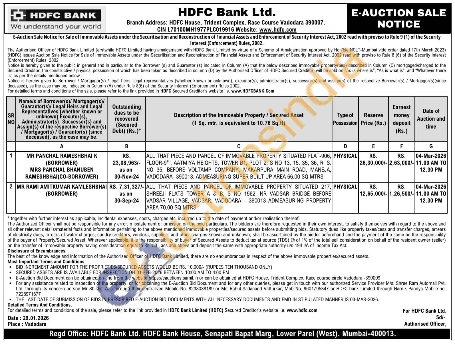 ALL THAT PIECE AND PARCEL OF IMMOVABLE PROPERTY SITUATED 217, SHREEJI FLATS TOWER A & B, S NO 1562, NR VADSAR BRIDGE BEFORE VADSAR VILLAGE, VADSAR, VADODARA 390013 ADMEASURING PROPERTY AREA 70.00 SQ MTRS