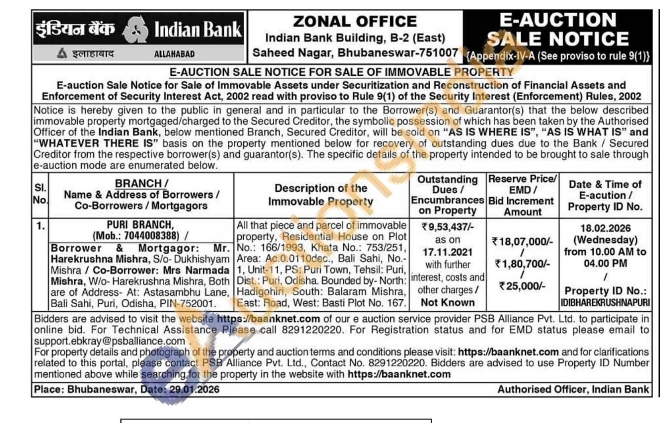 All that piece and parcel of immovable property, Residential House on Plot No.: 166/1993, Khata No.: 753/251, Area: Ac.0.0110dec., Bali Sahi, No.-1, Unit-11, PS: Puri Town, Tehsil: Puri, Dist.: Puri, Odisha. Bounded by- North: Hadigohiri, South: Balaram Mishra, East: Road, West: Basti Plot No. 167.
