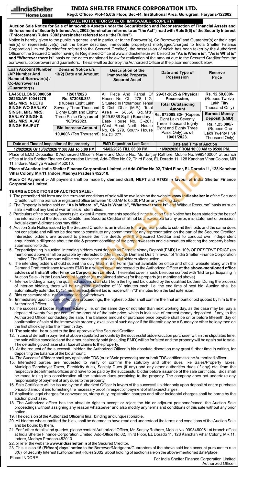 All Piece And Parcel Of House No. CL 278, LIG, Situated In Pithampur, Tehsil & Dist. Dhar (MP) P Total Area 58.50 Sq. Mtr. (629.6888 Sq.ft.) Boundary: East House No. West Road, North House No. CI- 279. South House No. C-277.