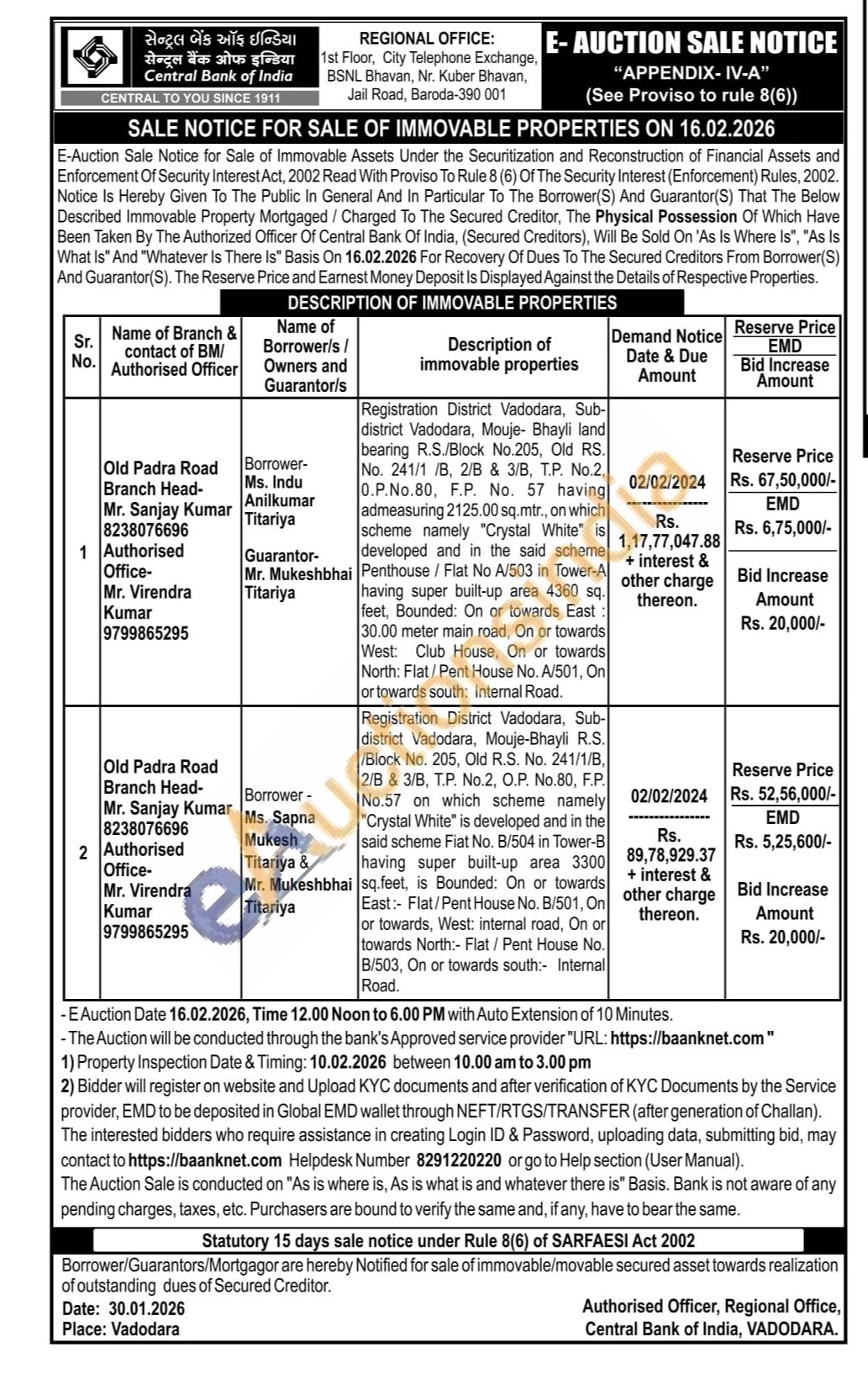 Registration District Vadodara, Sub-district Vadodara, Mouje- Bhayli land bearing R.S./Block No.205, Old RS. No. 241/1 /B, 2/B & 3/B, T.P. No.2, 0.P.No.80, F.P. No. 57 having admeasuring 2125.00 sq.mtr., on which scheme namely "Crystal White" is developed and in the said scheme Penthouse / Flat No A/503 in Tower-A having super built-up area 4360 sq. feet, Bounded: On or towards East: 30.00 meter main road, On or towards West: Club House, On or towards North: Flat/Pent House No. A/501, On or towards south: Internal Road