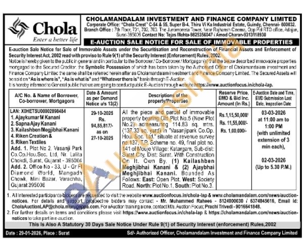 All the piece and parcel of immovable property bearing Old Plot No.5 (New Plol No.2) acmeasuring 114.83 sq. mtrs. (137.33 sq, yard) in "Vasarjipark Co.Op. Hou. Soc. Ltd." situate at revenue survey no. 137, T.P. Scheme no. 49, final plat no. 141 of Mouje Vilage: Katargam, Sub-dist Surat City Dist: Surat. With Construction On It. Own By. (1) Kailashben Meghjibhai Kanani & (2) Ajaybhai Meghjibhal Kanani. Bounded As Follows: East: Open Plot, West: Society Road North: Plot No. 1, South: Plot No.3