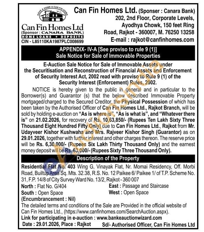 Residential Flat No. 403 Wing G, Vinayak Flat, Nr. Momai Residency, Off. Morbi Road, Builtup Area Sq. Mts. 32.38, R.S. No. 12 Paikee 6/ Paikee 1/ of T.P. Scheme No. 31, F.P. 14/8 of City Survey Ward No. 13/2, Rajkot-360007