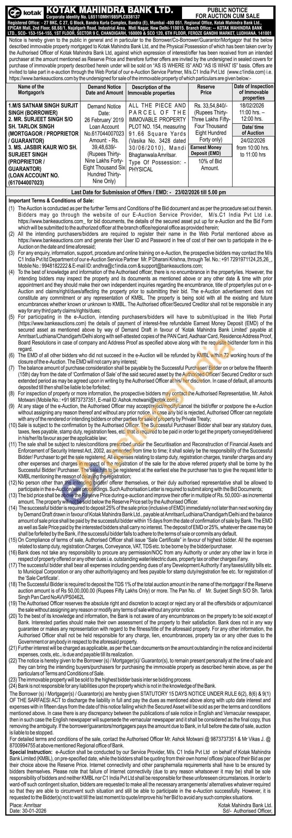 All THE PARCEL OF THE IMMOVABLE PROPERTY PLOT NO. 154. Measuring 91.66 sq yds Vasika no 3428 dated 30/06/2010 ,Mandi Bhagtanwala Amritsar