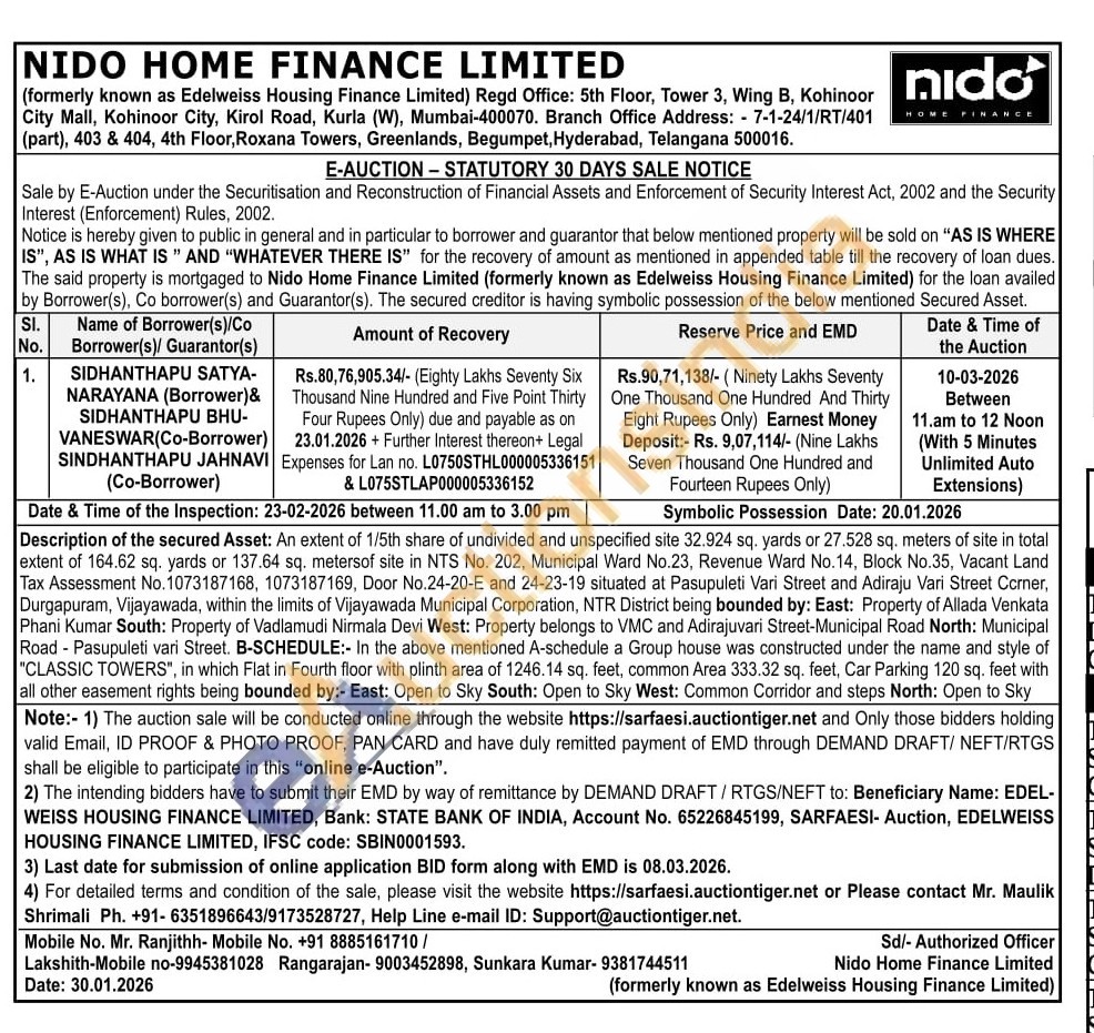 Description of the secured Asset: An extent of 1/5th share of undivided and unspecified site 32.924 sq. yards or 27.528 sq. meters of site in total extent of 164.62 sq. yards or 137.64 sq. metersof site in NTS No. 202, Municipal Ward No.23, Revenue Ward No.14, Block No.35, Vacant Land Tax Assessment No. 1073187168, 1073187169, Door No.24-20-E and 24-23-19 situated at Pasupuleti Vari Street and Adiraju Vari Street Corner, Durgapuram, Vijayawada, within the limits of Vijayawada Municipal Corporation, NTR District being bounded by: East: Property of Allada Venkata Phani Kumar South: Property of Vadlamudi Nirmala Devi West: Property belongs to VMC and Adirajuvari Street-Municipal Road North: Municipal Road Pasupuleti vari Street. B-SCHEDULE:- In the above mentioned A-schedule a Group house was constructed under the name and style of "CLASSIC TOWERS", in which Flat in Fourth floor with plinth area of 1246.14 sq. feet, common Area 333.32 sq. feet, Car Parking 120 sq. feet with all other easement rights being bounded by:- East: Open to Sky South: Open to Sky West: Common Corridor and steps North: Open to Sky