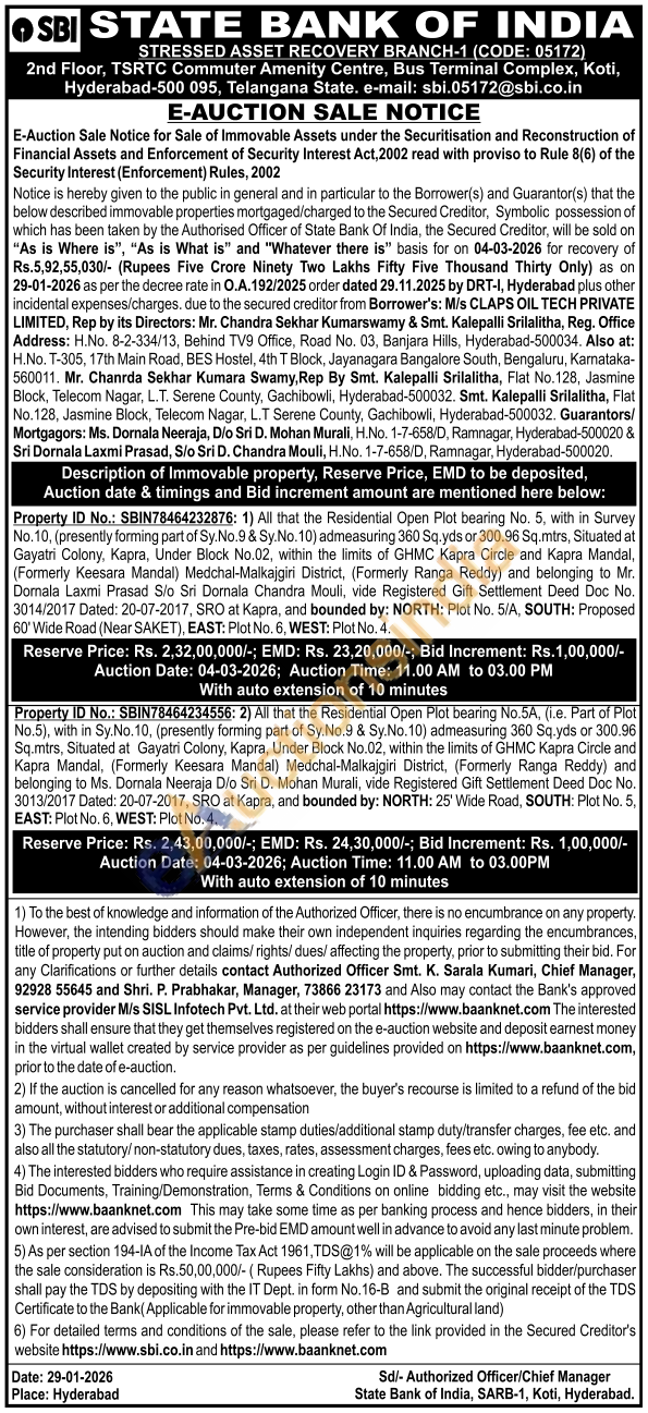 Property ID No.: SBIN78464232876: 1) All that the Residential Open Plot bearing No. 5, with in Survey No.10, (presently forming part of Sy. No.9 & Sy.No. 10) admeasuring 360 Sq.yds or 300.96 Sq.mtrs, Situated at Gayatri Colony, Kapra, Under Block No.02, within the limits of GHMC Kapra Circle and Kapra Mandal, (Formerly Keesara Mandal) Medchal-Malkajgiri District, (Formerly Ranga Reddy) and belonging to Mr. Domala Laxmi Prasad Sio Sri Dornala Chandra Mouli, vide Registered Gift Settlement Deed Doc No. 3014/2017 Dated: 20-07-2017, SRO at Kapra, and bounded by: NORTH: Plot No. 5/A, SOUTH: Proposed 60' Wide Road (Near SAKET), EAST: Plot No. 6, WEST: Plot No. 4.