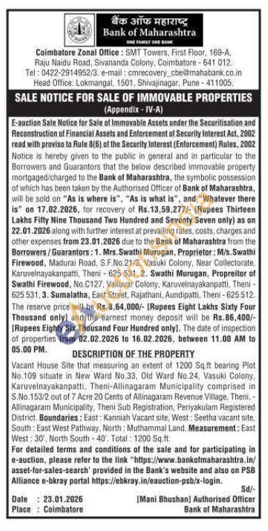 All that part and parcel of land admeasuring 0.60 cents of land in S. No.226/4 in Vallathirakottai Village, in Alangudi Taluk, Pudukottai Registration District & Registration Sub District, Pudukottai District, had been laid out and approved by President of Vallathirakottai Village Panchayat as Sri. Lakshmi Colony along with 2805 Sq.ft. (Approx.) residential building and the common rights in all roads and all other appurtenances, usufructs, easements, right of access attached thereto and improvements thereon owned by Mr. Parisuravoothar B. more particularly described in Sale Deed No.1400/2019 dated 22.03.2019 and Sale Deed No.3317/2019 dated 12.07.2019 of Joint I SRO, Pudukottai, with following Boundaries and Measurements: Plot No.6 Four Boundaries- North of Plot No.7 and East West 16 Feet Road, South of Samjudeen and others land, East of: Ibrahim Ravuthar land, West of: Plot No.5. Measurement-East west Northern side 35 feet, East West Southern Side 30 feet, North South both side 50 feet, Total 1625 Square Feet (150.97 Square Meter) Plot No.6 As per New Sub Division SF No.226/4A. Plot No.5 Four Boundaries North of 13 Feet Road, South of Samjudeen and others land, East of: Plot No.6. West of: Plot No.4. Measurement- East west both side 30 feet, North South both side 50 feet, Total 1500 Square Feet (139.35 Square Meter) Plot No.5 Old SF No.226/4B as per New Sub Division SF No.226/481.