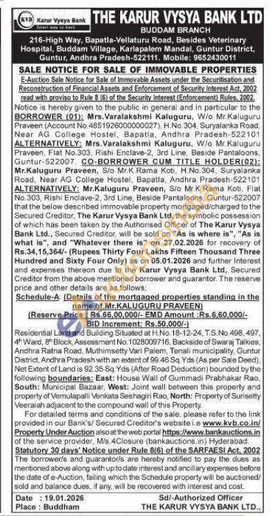 Schedule-A (Details of the mortgaged properties standing in the name of Mr.KALUGURU PRAVEEN) : Residential Land and Building Situated at H.No. 18-12-24, T.S.No. 498, 497, 4 Ward, 8 Block, Assessment No. 1028009716, Backside of Swaraj Talkies, Andhra Ratna Road, Muthimsetty Vari Palem, Tenali municipality, Guntur District, Andhra Pradesh with an extent of 99.46 Sq. Yds (As per Sale Deed), Net Extent of Land is 92.35 Sq. Yds (After Road Deduction) bounded by the following boundaries: East: House Wall of Gummadi Prabhakar Rao, South: Municipal Bazaar, West: Joint wall between this property and property of Vemulapalli Venkata Seshagiri Rao, North: Property of Surisetty Veeraiah adjacent to the compound wall of this Property