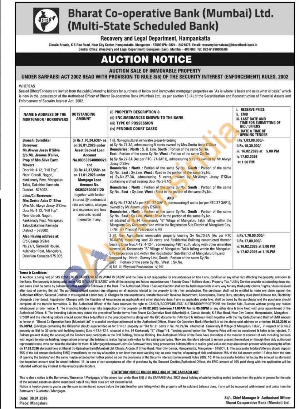 2. Non Agricultural immovable property bearing Sy No.70-6A (As per RTC 70-6AP8) measuring land 33 cents and Residential Building constructed thereon bearing Door Nos.4-12, 4-12-1, admeasuring 4901 sq.ft. along with other amenities situated at, Kankanady "B" Village of Mangaluns Taluk falling within the Mangaluru City Corporation and within the Registration Sub-District of Mangaluru City and bounded by: North: Survey Line, South Portion of the same Sy. No. East Portion of the same Sy.No, West Sy.No.