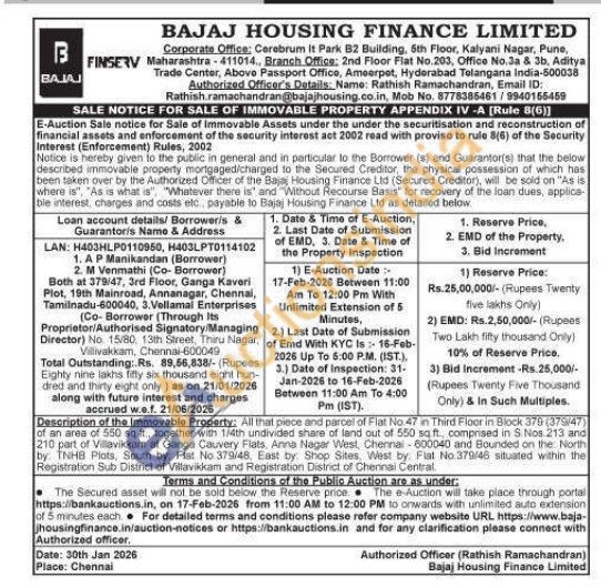 Description of the Immovable Property: All that piece and parcel of Flat No 47 in Third Floor in Block 370 (370/47) of an area of 550 sq.ft., together with 1/4th undivided share of land out of 550 sq.ft., comprised in S. Nos 213 and 210 part of Villavikkam at Ganga Cauvery Flats. Anna Nagar West, Chennai-600040 and Bounded on the North by TNHB Plots, South by: Flat No. 379/48, East by: Shop Sites, West by Flat No 379/46 situated within the Registration Sub District of Villavikkam and Registration District of Chennai Central