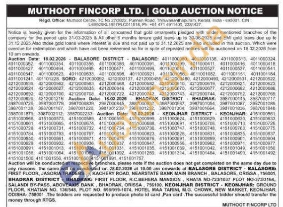 Muthoot Fincorp Ltd Gold Auctions Auction in Balasore