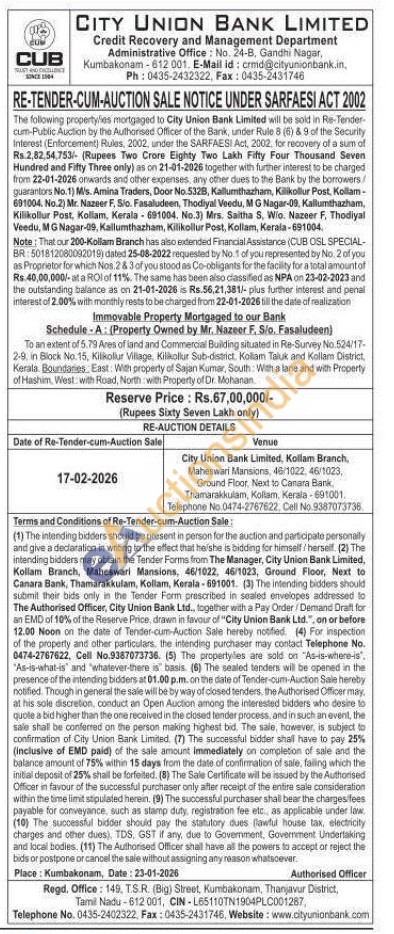 To an extent of 5.79 Ares of land and Commercial Building situated in Re-Survey No.524/17-2-9. in Block No. 15, Kilikollur Village, Kilikollur Sub-district. Kollam Taiuk and Kollam District, Kerala Boundaries, East: With property of Sajan Kumar, South: With a lane and with Property of Hashim, West with Road, North with Property of Dr. Mohanan