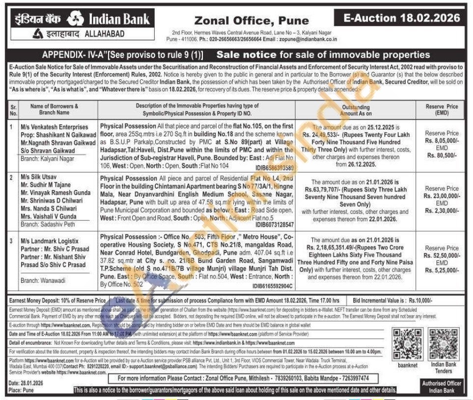Physical Possession All piece and parcel of Residential Flat No L4, 2nd Floor in the building Chintamani Apartment bearing S No 77/3A/1, Hingne Mala, Near Dnyanvardhini English Medium School, Sasane Nagar, Hadapsar, Pune with built up area of 47.58 sq.mtr lying within the limits of Pune Municipal Corporation and bounded as below: East: Read Side open, West: Front Open and Road, South: Open, North: Adjacent Flat no.5