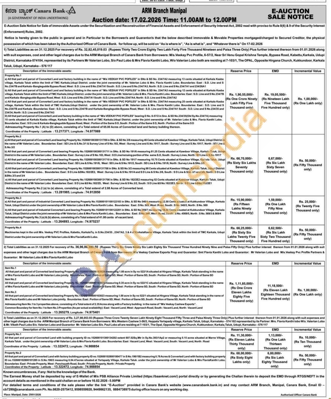 Property No.2 a) All that part and parcel of Converted Land bearing Property No. 152600100300131709 in SNo. & SD No 3/8 measuring 46 Cents situated at Kawdoor Village, Karkala Taluk, Udupi District in the name of Mr Valerian Lobo. Boundaries: East: SD Line & S.No.3/1 & Survey Line of S No.183, West: Survey Line and S.No. 191/7, South: Survey Line and S.No. 191/7, North: SD Line & S.No.3/2 b) All that part and parcel of Converted Land bearing Property No.152600100300131711 in SNo. & SD No 191/6 measuring 81.25 Cents situated at Kawdoor Village, Karkala Taluk, Udupi District in the name of Mr Valerian Lobo. Boundaries: East: Survey Line of S No. 183, West: SD Line/remaing portion of the same S.D, South: Survey Lines, North: SD Line & S.No. 191/7 c) All that part and parcel of Converted Land bearing Property No. 152600100300131710 in SNo. & SD No 191/7 measuring 10.75 Cents situated at Kawdoor Village, Karkala Taluk, Udupi District in the name of Mr Valerian Lobo. Boundaries: East: SD Line & S No.191/6, West: SD Line & S No. 191/2, South: SD Line & SNo. 191/6, North: Survey Line & SNo.3/8 d) All that part and parcel of Converted Land bearing Property No. 152600100300131708 in SNo. & SD No 3/2 measuring 98 Cents situated at Kawdoor Village, Karkala Taluk, Udupi District in the name of Mr Valerian Lobo... Boundaries: East: SD Line &SNo. 182/2E2, West: Survey Line & S No.191/4 and SD Line & S No.3/6, South: SD Line & SNo.3/1 and 3/8, North: SD Line &SNo.3/3 and 3/4 e) All that part and parcel of Converted Land bearing Property No. 152600100300131706 in SNo. & SD No 182/2E2 measuring 52 Cents situated at Kawdoor Village, Karkala Taluk, Udupi District in the name of Mr Valerian Lobo Boundaries: East: SD Line &S No. 182/2D, West: Survey Line & S No.3/2, South: SD Line &S No. 182/2E3, North: SD Line &SNo. 182/201 Admeasuring Property No.2 (a) to (e) above, consisting of a Total extend of 2.88 Acres of Converted land. Coordinates of the Property: Latitude: 13.281985, Longitude: 74.912850