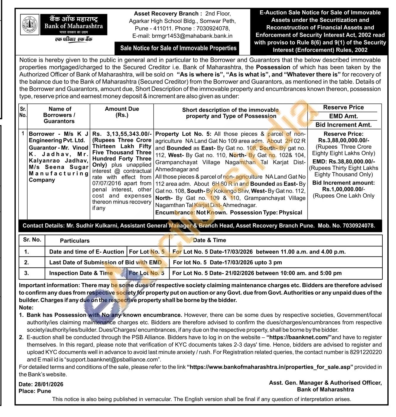 Property Lot No. 5: All those pieces & parcel of non-agriculture NA Land Gat No 109 area adm. About 2H 02 R and Bounded as East- By Gat no. 108, South- By gat no. 112, West- By Gat no. 110, North- By Gat no. 102& 104, Grampanchayat Village Nagamthan Tal Karjat Dist-Ahmednagar and All those pieces & parcel of non- agriculture NA Land Gat No 112 area adm. About 6H 60 R in and Bounded as East-By Gat no. 108, South- By Kokango Shiv, West-By Gat no. 112, North- By Gat no. 109 & 110, Grampanchayat Village Nagamthan Tal Karjat Dist-Ahmednagar