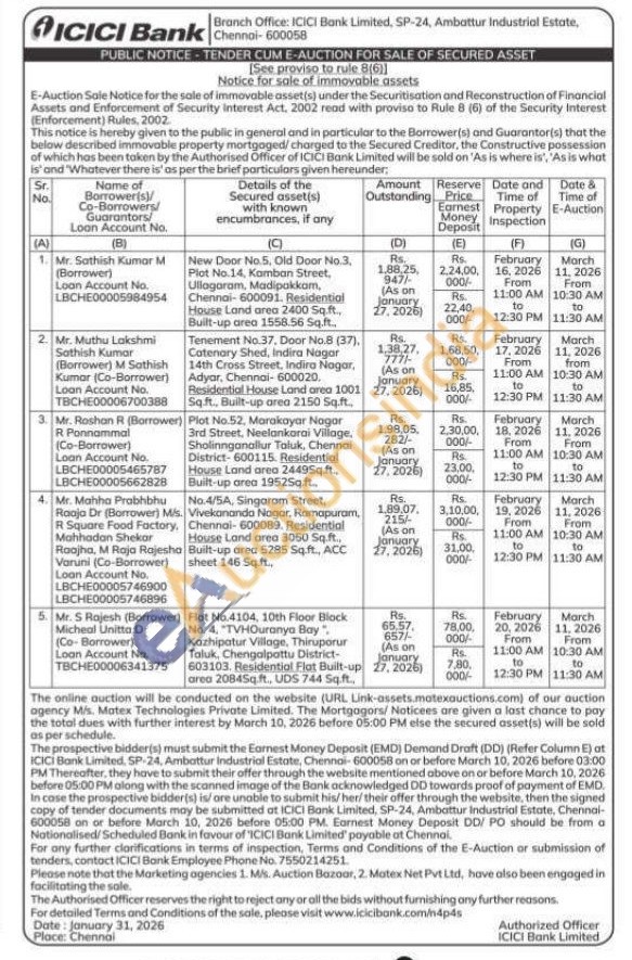 4) No.4/5A, Singaram Street, Vivekananda Nagar, Ramapuram, Chennai-600089. Residential House Land area 3050 Sq.ft., Built-up area 5285 Sq. ft., ACC sheet 146 Sq.ft.,