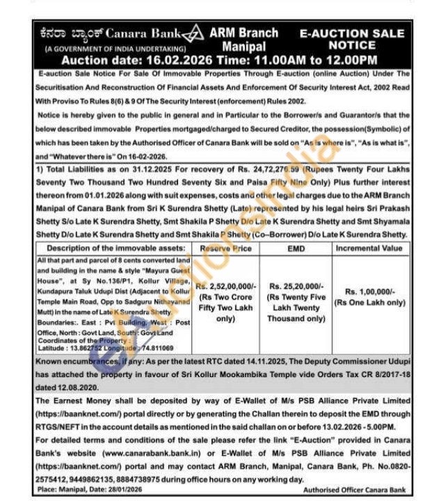 All that part and parcel of 8 cents converted land and building in the name & style "Mayura Guest House", at Sy No.136/P1, Kollur Village, Kundapura Taluk Udupi Dist (Adjacent to Kollur Temple Main Road, Opp to Sadguru Nithayanad Mutt) in the name of Late K Surendra Shetty. Boundaries:. East: Pvt Building, West: Post Office, North: Govt Land, South: Govt Land