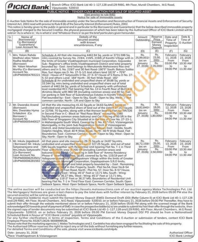 1) Schedule-A All that site measuring 4462.94 Sq. yards or 3731.598 Sq. mtrs covered by Survey No. 219/4, 219/5, 219/6 of Kanithi Village with in the limits of Greater Visakhapatnam municipal Corporation, Gajuwaka Sub-Registrar's office limits Visakhapatnam District and total property bounded by: East: land belongs to Manukonda Maheswara Rao and others and in S. No. 219/7 and 30 feet Road-190'5" South: Bolusu Subba Rao, Suri Appa rao D. No. 27-5-1/2 And others land 181'6" 70'6" West: House of P Satyavathi D No. 27-5-37 House of S Ramu D No. 27-5-32 and others Land- 184' North: 30 feet Wide Road-182 Schedule-B An undivided and unspecified share of 39.88 Sq. yards or 33.344 Sq. mtrs being undivided and unspecified share out of total extent of 4462.94 Sq. yards of Schedule A property with unfinished level residential RCC Flat bearing Flat No. 13 in Fourth floor of BLOCK B (Krishna Block) with 960 Sft (including common areas) and 80 Sq. feet car parking in Stilt floor of Subrahmanya Estates in Kanithi Village and Flat bounded by:- East: Open to Sky, South: Open to Sky, West: 7 feet common corridor, North: Lift and Open to Sky