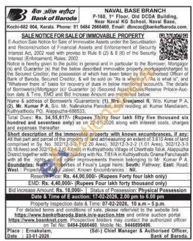 All that part and parcel of the property of land admeasuring an extent of 3.610 Ares of land comprised in Sy. No. 302/12-3-2-1 (2.20 Ares), 302/12-3-2-2 (1.01 Ares), 302/12-3-3 (0.18 Ares) and 302/12-4-2 (0.4 Ares) in Kuthiyathodu Village of Cherthala Taluk, Alappuzha District together with residential building with No. 7/81/A in Kuthiyathodu Grama Panchayath with all the rights and all other improvements therein belonging to Mr. Kumar PA Boundaries: North: Properties of Fousi's Legal heirs, South: Pathway: East: Road: West: Property of Abdul Jaleel, Known Encumbrances: NII.