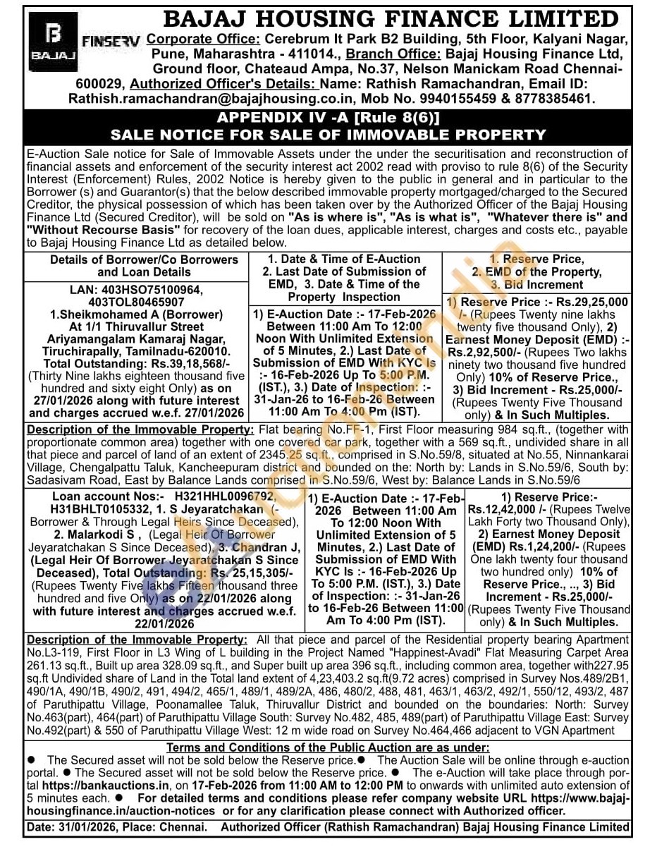 Description of the Immovable Property: Flat bearing No.FF-1, First Floor measuring 984 sq.ft., (together with proportionate common area) together with one covered car park, together with a 569 sq.ft., undivided share in all that piece and parcel of land of an extent of 2345.25 sq.ft., comprised in S.No.59/8, situated at No.55, Ninnankarai Village, Chengalpattu Taluk, Kancheepuram district and bounded on the: North by: Lands in S.No.59/6, South by: Sadasivam Road, East by Balance Lands comprised in S.No.59/6, West by: Balance Lands in S.No.59/6