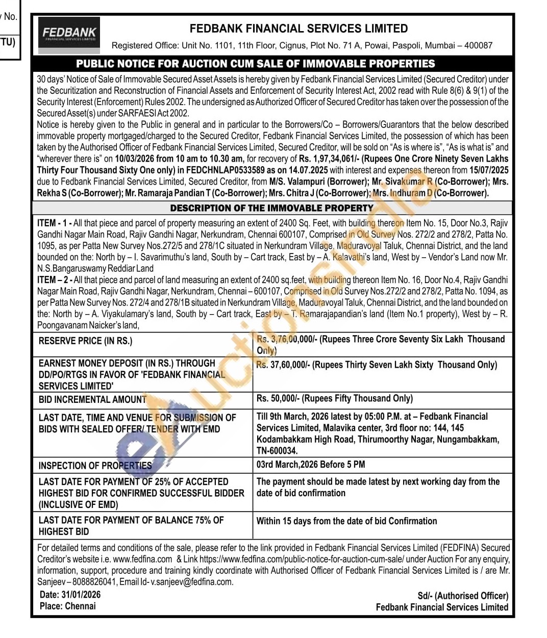 ITEM-1-All that piece and parcel of property measuring an extent of 2400 Sq. Feet, with building thereon Item No. 15, Door No.3, Rajiv Gandhi Nagar Main Road, Rajiv Gandhi Nagar, Nerkundram, Chennai 600107, Comprised in Old Survey Nos. 272/2 and 278/2, Patta No. 1095, as per Patta New Survey Nos.272/5 and 278/1C situated in Nerkundram Village, Maduravoyal Taluk, Chennai District, and the land bounded on the: North by -1. Savarimuthu's land, South by - Cart track, East by -A. Kalavathi's land, West by - Vendor's Land now Mr. N.S.Bangaruswamy Reddiar Land ITEM-2-All that piece and parcel of land measuring an extent of 2400 sq.feet, with building thereon Item No. 16, Door No.4, Rajiv Gandhi Nagar Main Road, Rajiv Gandhi Nagar, Nerkundram, Chennai-600107, Comprised in Old Survey Nos.272/2 and 278/2, Patta No. 1094, as per Patta New Survey Nos. 272/4 and 278/1B situated in Nerkundram Village, Maduravoyal Taluk, Chennai District, and the land bounded on the: North by - A. Viyakulamary's land, South by Cart track, East by - T. Ramarajapandian's land (Item No.1 property), West by - R. Poongavanam Naicker's land,