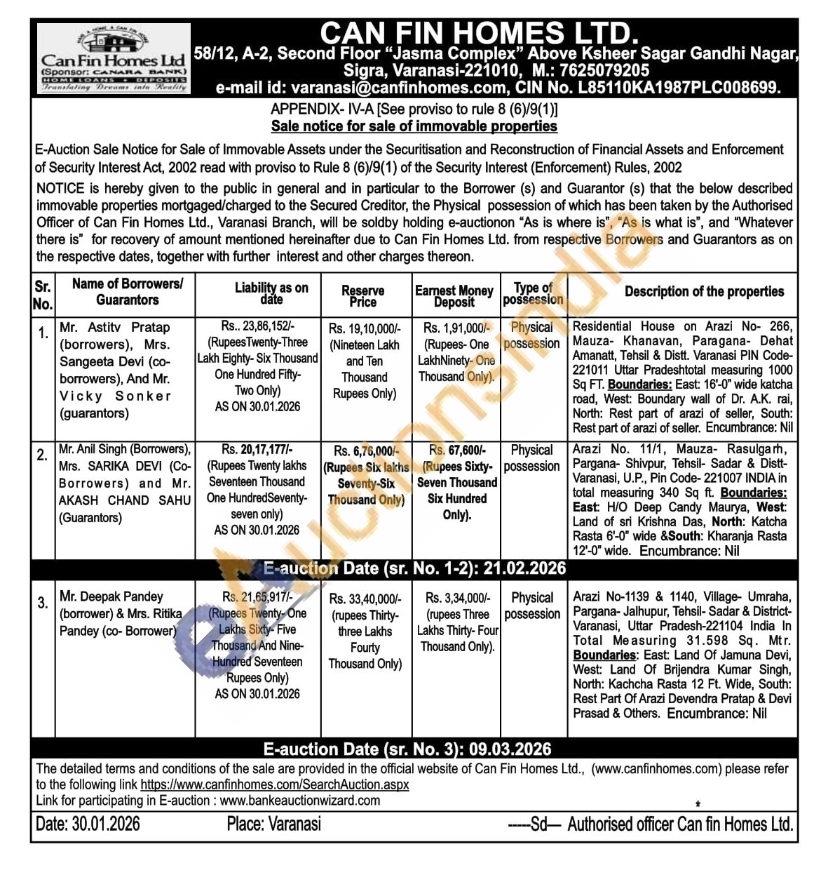 Residential House on Arazi No- 266, Mauza- Khanavan, Paragana- Dehat Amanatt, Tehsil & Distt. Varanasi PIN Code-221011 Uttar Pradeshtotal measuring 1000 Sq FT. Boundaries: East: 16'-0" wide katcha road, West: Boundary wall of Dr. A.K. rai, North: Rest part of arazi of seller, South: Rest part of arazi of seller. Encumbrance: Nil