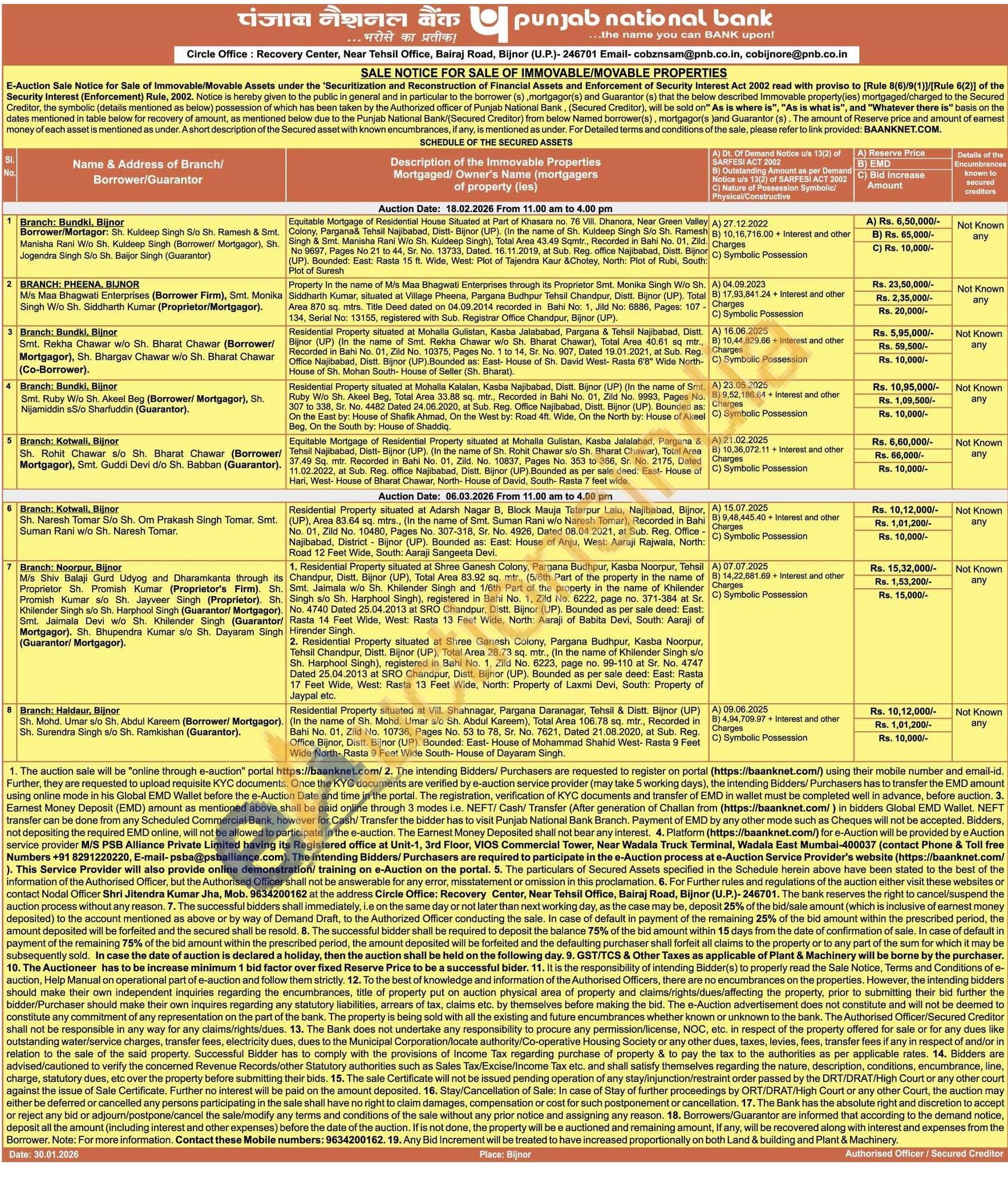 1. Residential Property situated at Shree Ganesh Colony, Pargana Budhpur, Kasba Noorpur, Tehsil Chandpur, Distt. Bijnor (UP), Total Area 83.92 sq. mtr., (5/6th Part of the property in the name of Smt. Jaimala w/o Sh. Khilender Singh and 1/6th Part of the property in the name of Khilender Singh s/o Sh. Harphool Singh), registered in Bahi No. 1, Zild No. 6222, page no. 371-384 at Sr. No. 4740 Dated 25.04.2013 at SRO Chandpur, Distt. Bijnor (UP), Bounded as per sale deed: East: Rasta 14 Feet Wide, West: Rasta 13 Feet Wide, North: Aaraji of Babita Devi, South: Aaraji of Hirender Singh. 2. Residential Property situated at Shree Ganesh Colony, Pargana Budhpur, Kasba Noorpur, Tehsil Chandpur, Distt. Bijnor (UP), Total Area 28.73 sq. mtr., (In the name of Khilender Singh s/o Sh. Harphool Singh), registered in Bahi No. 1, Zild No. 6223, page no. 99-110 at Sr. No. 4747 Dated 25.04.2013 at SRO Chandpur, Distt. Bijnor (UP). Bounded as per sale deed: East: Rasta 17 Feet Wide, West: Rasta 13 Feet Wide, North: Property of Laxmi Devi, South: Property of Jaypal etc.