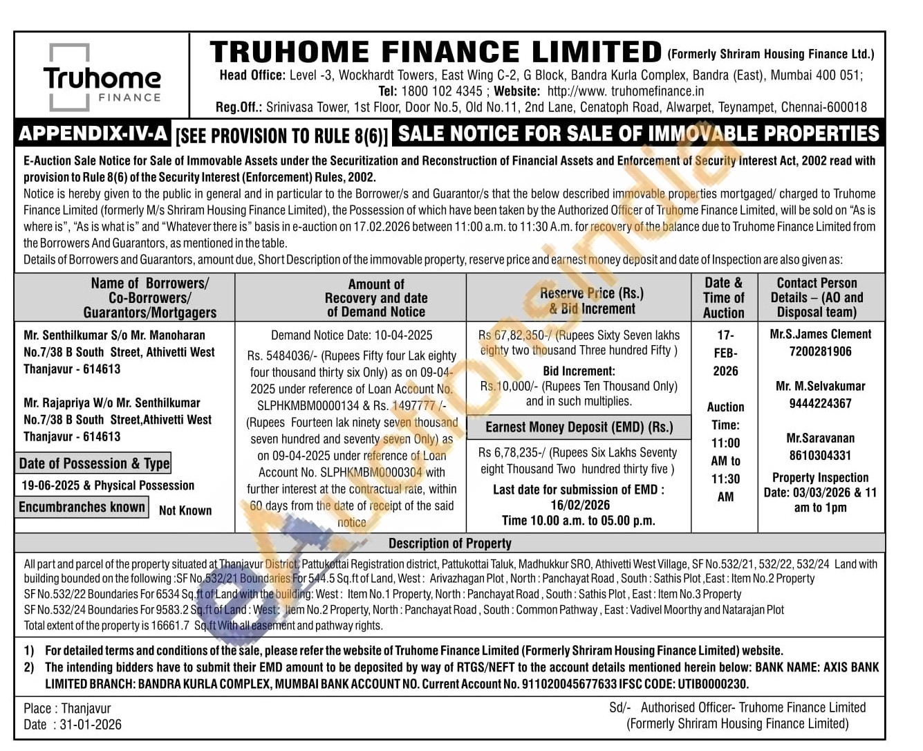 All part and parcel of the property situated at Thanjavur District, Pattukottai Registration district, Pattukottai Taluk, Madhukkur SRO, Athivetti West Village, SF No.532/21, 532/22, 532/24 Land with building bounded on the following: SF No.532/21 Boundaries For 544.5 Sq.ft of Land, West: Arivazhagan Plot, North: Panchayat Road, South: Sathis Plot, East: Item No.2 Property SF No.532/22 Boundaries For 6534 Sq.ft of Land with the building: West: Item No.1 Property, North: Panchayat Road, South: Sathis Plot, East: Item No.3 Property SF No.532/24 Boundaries For 9583.2 Sq.ft of Land: West: Item No.2 Property, North: Panchayat Road, South: Common Pathway, East: Vadivel Moorthy and Natarajan Plot