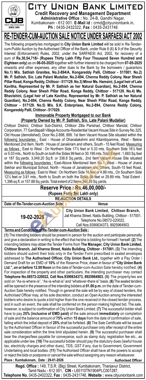 Chittoor District, Chittoor Sub-District, Chittoor Zilla Parishad, Chittoor Mandal, Chittoor Corporation, 77 Gandiapalli Village Accounts-Residential Vacant House Site in Survey No.325, Old House (demolished), Door No.2-898, 899. 1st Item Vacant House Site situated within the following boundaries East House of Dhanalakshmi and Kilambiyamma, West Below Mentioned 2nd Item, North: House of Janakiram and others, South-15 feet Road. Measuring as follows: East to West: On Northern Side 17% feet or 5.33 mts. Southern Side 16% feet or 5.03 mts., North to South on both the Sides 99 feet or 30.195 mts. Total Extent: 1,683 Sq.feet or 187 Sq.yards. 3,049.20 Sq.ft. or 338.8 Sq yards., 2nd Item Vacant House Site situated within the following boundaries: East-Above Mentioned Item No.1, West House of Jnana Sekhar and Municipal School, North House of Janakiram and Others, South-15 feet Road, Measuring as follows: East to West: On Northem Side 16 feet or 4.88 mts., On Southern Side 12% feet or 3.81 mts., North to South on both the Sides 98 feet or 29.89 mts. Total Extent: 1,396 sq.ft. or 157.88 Sq.yards. Total extent of 2 Items 344.88 Sq.yards,