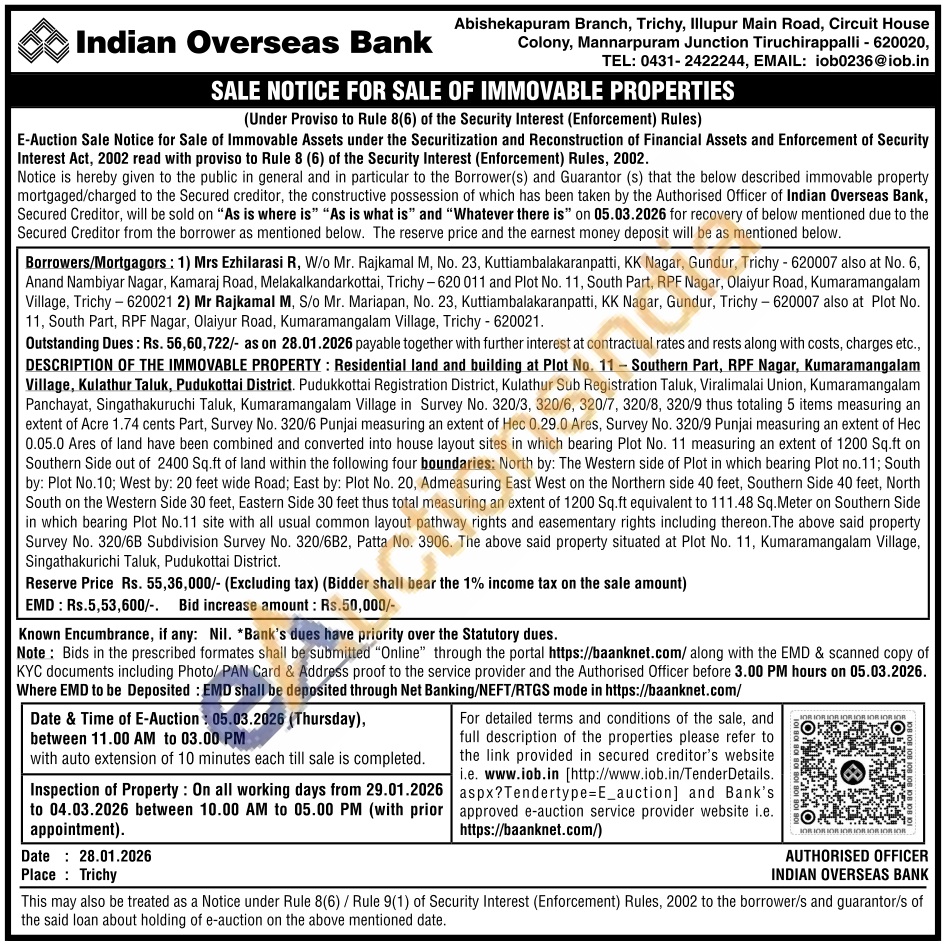 Pudukkottai Registration District, Kulathur Sub Registration Taluk, Viralimalai Union, Kumaramangalam Panchayat, Singathakuruchi Taluk, Kumaramangalam Village in Survey No. 320/3, 320/6, 320/7, 320/8, 320/9 thus totaling 5 items measuring an extent of Acre 1.74 cents Part, Survey No. 320/6 Punjai measuring an extent of Hec 0.29.0 Ares, Survey No. 320/9 Punjai measuring an extent of Hec 0.05.0 Ares of land have been combined and converted into house layout sites in which bearing Plot No. 11 measuring an extent of 1200 Sq.ft on Southern Side out of 2400 Sq.ft of land within the following four boundaries: North by: The Western side of Plot in which bearing Plot no.11; South by: Plot No.10; West by: 20 feet wide Road; East by: Plot No. 20, Admeasuring East West on the Northern side 40 feet, Southern Side 40 feet, North South on the Western Side 30 feet, Eastern Side 30 feet thus total measuring an extent of 1200 Sq.ft equivalent to 111.48 Sq.Meter on Southern Side in which bearing Plot No.11 site with all usual common layout pathway rights and easementary rights including thereon. The above said property Survey No. 320/6B Subdivision Survey No. 320/6B2, Patta No. 3906. The above said property situated at Plot No. 11, Kumaramangalam Village, Singathakurichi Taluk, Pudukottai District.