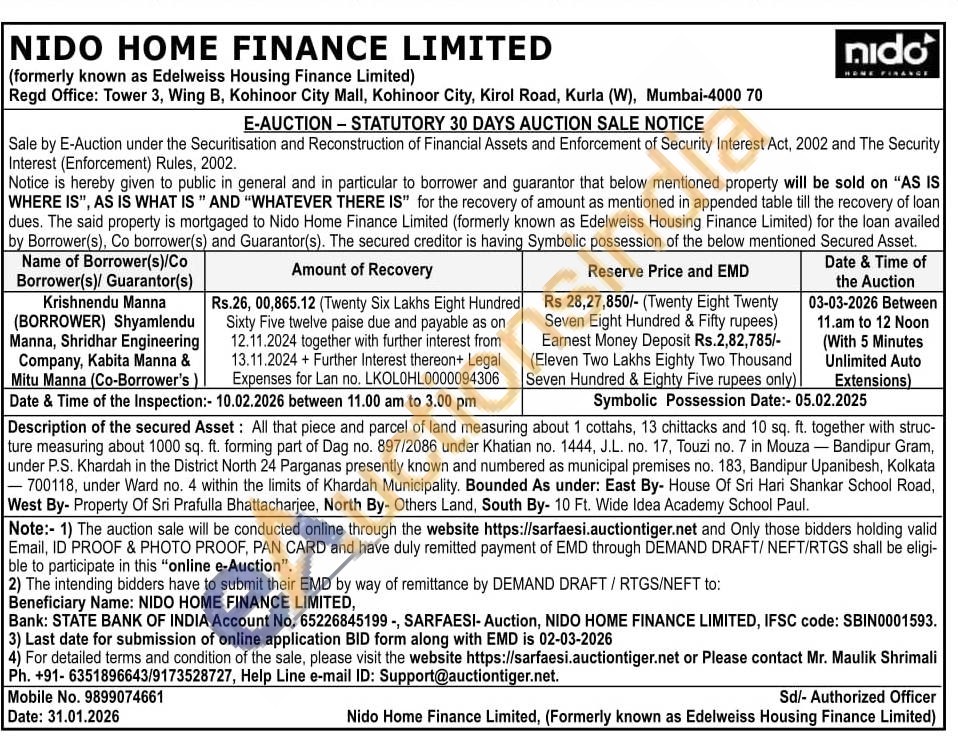 Description of the secured Asset: All that piece and parcel of land measuring about 1 cottahs, 13 chittacks and 10 sq. ft. together with struc-ture measuring about 1000 sq. ft. forming part of Dag no. 897/2086 under Khatian no. 1444, J.L. no. 17, Touzi no. 7 in Mouza - Bandipur Gram, under P.S. Khardah in the District North 24 Parganas presently known and numbered as municipal premises no. 183, Bandipur Upanibesh, Kolkata -700118, under Ward no. 4 within the limits of Khardah Municipality. Bounded As under: East By- House Of Sri Hari Shankar School Road, West By- Property Of Sri Prafulla Bhattacharjee, North By- Others Land, South By- 10 Ft. Wide Idea Academy School Paul.