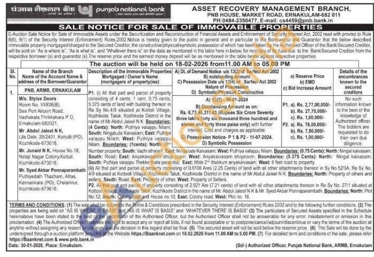 All that part and parcel of property consisting of 2.921 Are (7.21 cents) of land with all other attachments thereon in Re Sy No. 27/1 situated at Kottool Village, Kozhikode Taluk, Kozhikode District in the name of Mr. Abdul Jaleel NK & Mr. Syed Akbar Ponnaparambath Boundaries: North: Plot No. 12, South: Colony road and House no.10, East: Colony read: West: Plot no 16.