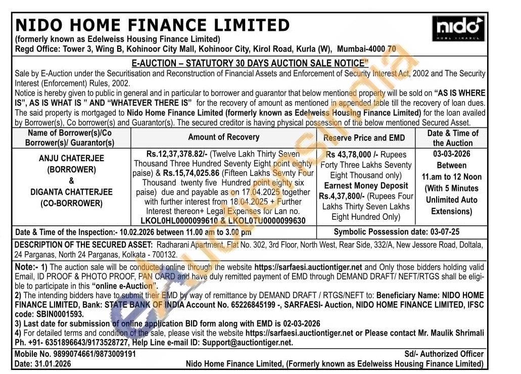 DESCRIPTION OF THE SECURED ASSET: Radharani Apartment, Flat No. 302, 3rd Floor, North West, Rear Side, 332/A, New Jessore Road, Doltala, 24 Parganas, North 24 Parganas, Kolkata - 700132.