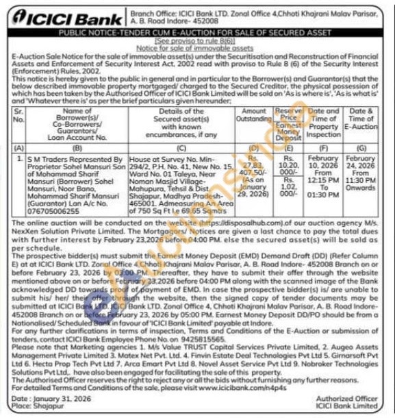 House at Survey No. Min-294/2, P.H. No. 41, New No. 15. Ward No. 01 Taleya, Near Noman Masjid Village-Mahupura, Tehsil & Dist. Shajapur, Madhya Pradesh-465001, Admeasuring An Area of 750 Sq Ft le 69.65 Sqmtrs
