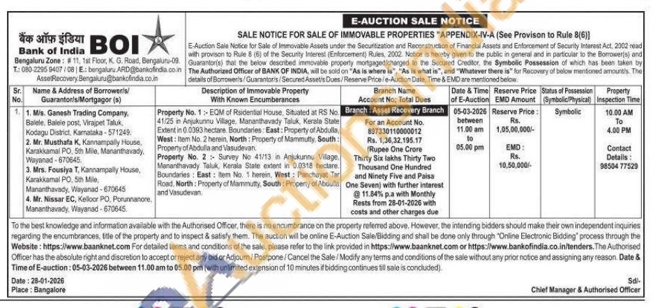 Property No. 1:- EQM of Rsidential House, Situated at RS No. 41/25 in Anjukunnu Village. Mananthavady Taluk, Kerala State Extent in 0.0393 hectare Boundaries: East: Property of Abdulla, West: Item No. 2 herein, North: Property of Mammutty, South: Property of Abdulla and Vasudevan Property No. 2: Survey No 41/13 in Anjukunnu Village. Mananthavady Taluk, Kerala State extent in 0.0318 hectare. Boundaries: East: Item No. 1 herein, West: Panchayat Tar Road, North: Property of Mammutty, South: Property of Abdulla and Vasudevan.