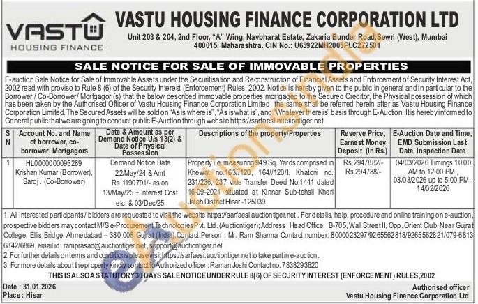 Property i.e. measuring 949 Sq. Yards comprised in Khewat no. 163//120, 164//120/1. Khatoni no. 231/236, 237 vide Transfer Deed No.1441 dated 16-09-2021 situated at Kinnar Sub-tehsil Kheri Jalab District Hisar-125039