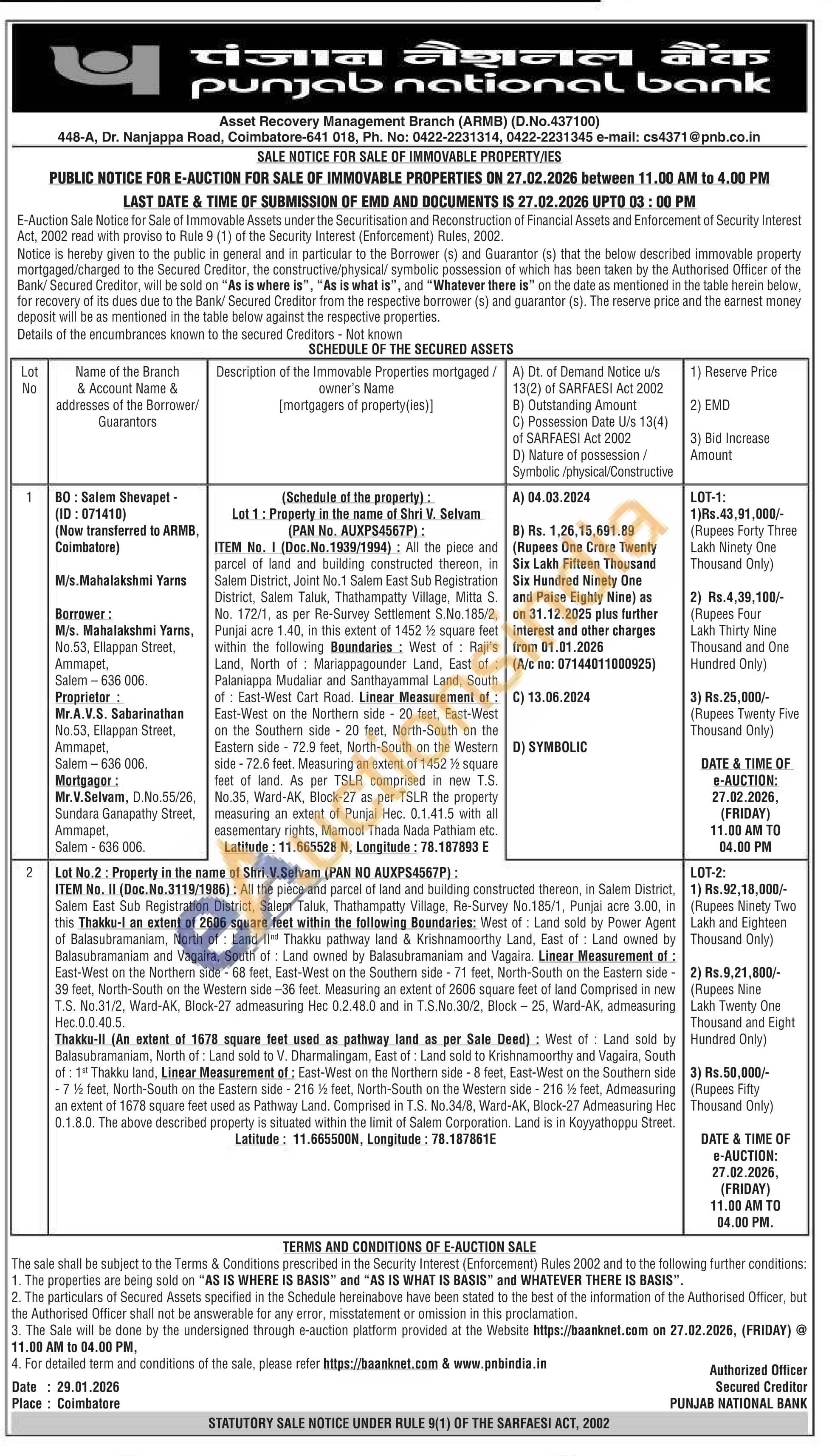 ITEM No. I (Doc. No. 1939/1994): All the piece and parcel of land and building constructed thereon, in Salem District, Joint No.1 Salern East Sub Registration District, Salem Taluk, Thathampatty Village, Mitta S. No. 172/1, as per Re-Survey Settlement S.No.185/2, Punjai acre 1.40, in this extent of 1452 1½ square teat within the following Boundaries: West of Raji's Land, North of Mariappagounder Land, East of Palaniappa Mudaliar and Santhayammal Land, South of East-West Cart Road. Linear Measurement of East-West on the Northern side 20 feet, East-West on the Southern side 20 feet, North-South on the Eastern side-72.9 feet, North-South on the Western side-72.6 feet. Measuring an extent of 1452 1½ square feet of land. As per TSLR comprised in new T.S. No.35, Ward-AK, Block-27 as per TSLR the property measuring an extent of Punjai Hec. 0.1.41.5 with all easementary rights, Mamool Thada Nada Pathiam etc. Latitude: 11.665528 M. Longitude: 78.187893 E
