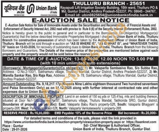 DESCRIPTION OF IMMOVABLE PROPERTY: Land in an extent of 150 sq.yds or 125.41sq. mts and building thereon, situated at Door No1-100, Survey No.87, Sakhamuru village, Thulluru Mandal, Tadikonda SRO, Guntur district. Boundaries of property (as per doc): East: Valaparia Babu Rao's property-52ft, South: Valaparla Bhagyam' s property-26ft, West: Panchayat Road-52ft, North: Valaparla Venkateswarlu's property-26ft