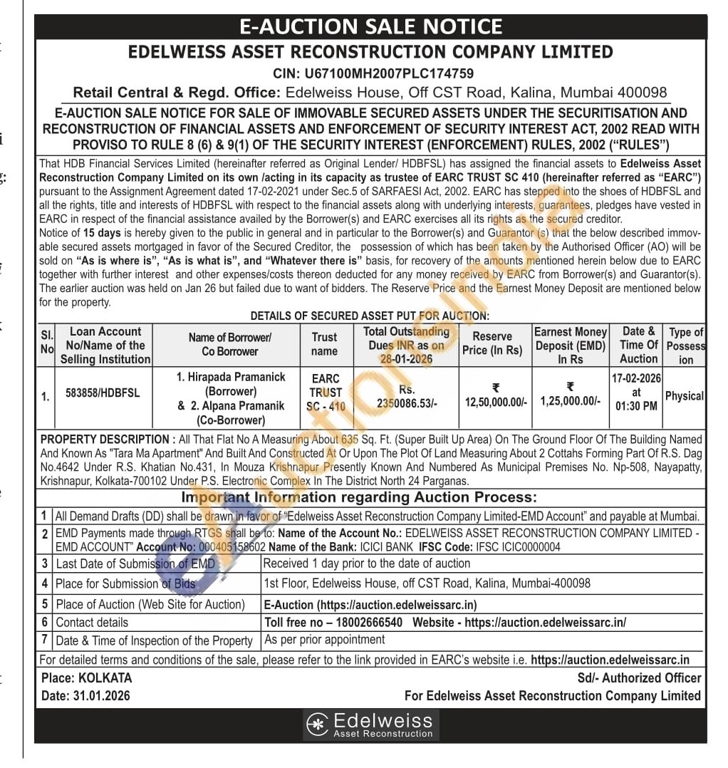 PROPERTY DESCRIPTION: All That Flat No A Measuring About 635 Sq. Ft. (Super Built Up Area) On The Ground Floor Of The Building Named And Known As "Tara Ma Apartment" And Built And Constructed At Or Upon The Plot Of Land Measuring About 2 Cottahs Forming Part Of R.S. Dag No.4642 Under R.S. Khatian No.431, In Mouza Krishnapur Presently Known And Numbered As Municipal Premises No. Np-508, Nayapatty, Krishnapur, Kolkata-700102 Under P.S. Electronic Complex In The District North 24 Parganas.