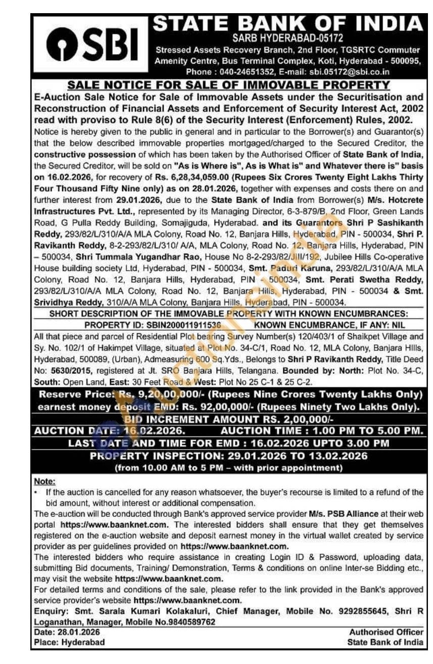All that piece and parcel of Residential Plot bearing Survey Number(s) 120/403/1 of Shaikpet Village and Sy. No. 102/1 of Hakimpet Village, situated at Plot No. 34-C/1, Road No. 12, MLA Colony, Banjara Hills, Hyderabad, 500089, (Urban), Admeasuring 600 Sq. Yds., Belongs to Shri P Ravikanth Reddy, Title Deed No: 5630/2015, registered at Jt. SRO Banjara Hills, Telangana. Bounded by: North: Plot No. 34-C, South: Open Land, East: 30 Feet Road & West: Plot No 25 C-1 & 25 C-2.