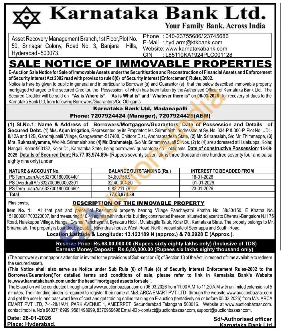 Item No. 1: All that part and parcel of Residential property bearing Village Panchayathi Khatha No. 38/30/150, E Khatha No. 151900901700320007, land measuring 510.41 sq.mts with industrial building constructed thereon, situated adjacent to Chennai-Bangalore N.H 75 Road, Halekuppa Village, Nangali Grama Panchayathi, Byrakuru Hobli, Mulabagilu Taluk, Kolar Dt., Karnataka State. The propety belongs to Mr. Sriramaiah. The property is bounded by East: T. Ravindra's house, West: Road, North: Vacant site of Seenappa and South: Road