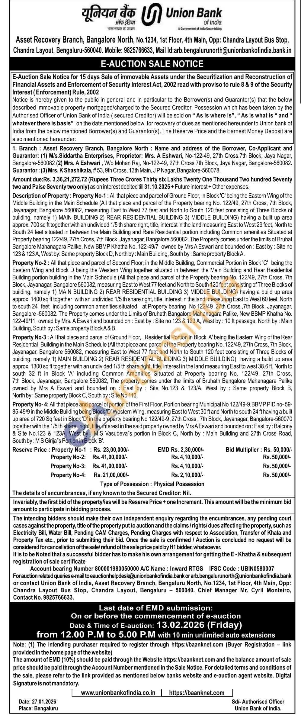 Property No-3: All that piece and parcel of Ground Floor,, Residential Portion in Block 'A' being the Eastern Wing of the Rear Residential Building in the Main Schedule (All that piece and parcel of the Property bearing No. 122/49, 27th Cross, 7th Block, Jayanagar, Bangalore 560082, measuring East to West 77 feet and North to South 120 feet consisting of Three Blocks of building, namely 1) MAIN BUILDING 2) REAR RESIDENTIAL BUILDING 3) MIDDLE BUILDING) having a build up area approx. 1300 sq ft together with an undivided 1/5 th share right, title, interest in the land measuring East to west 38.6 ft, North to south 32 ft in Block 'A' including Common Amenities Situated at Property bearing No. 122/49, 27th Cross, 7th Block, Jayanagar, Bangalore 560082, The property comes under the limits of Bruhath Bangalore Mahanagara Palike owned by Mrs A Eswari and bounded on East by: Site No.123 & 123/A, West by: Same property Block B, North by: Same property Block C, South by: Site No 113.