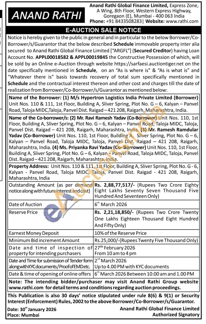 Property Address: Unit Nos. 110 & 111, 1st Floor, Building A, Sliver Spring, Plot No. G-6, Kalyan Panvel Road, Taloja MIDC, Taloja, Panvel Dist. Raigad 421 208, Raigarh, Maharashtra, India